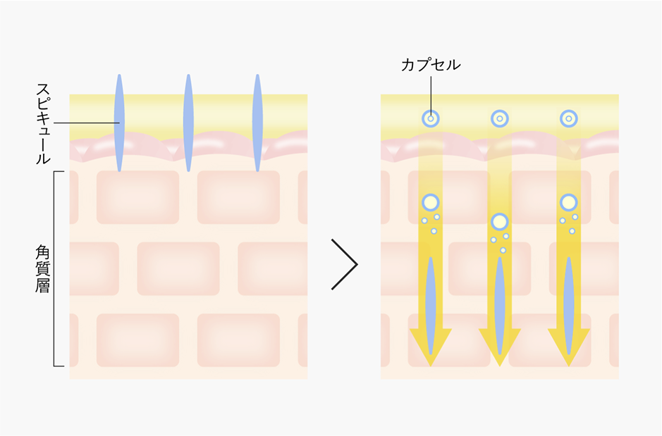 天然由来のスピキュールが成分の通り道を作り、美容成分の浸透*をサポート。肌に適度な刺激を与えながらハリのある引き締まった肌へと導く。